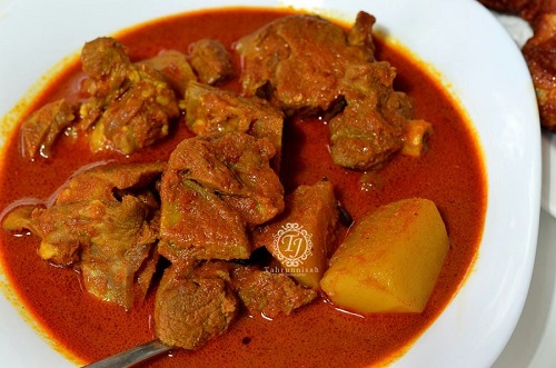 3. Kemudian, masukkan daging potong atau daging kambing gaul sebati dan tambah sedikit air. tutup penutup periuk biarkan sehingga daging empuk dan kemudian masukkan kentang. Masukkan air asam jawa perisakan dengan garam dan gula. Siap.