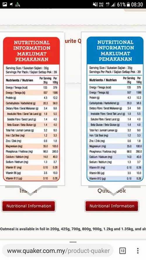 Jika dilihat kandungan Quaker oats, kandungan nutrisi pada label Instant dan Quick Oats adalah sama 100%