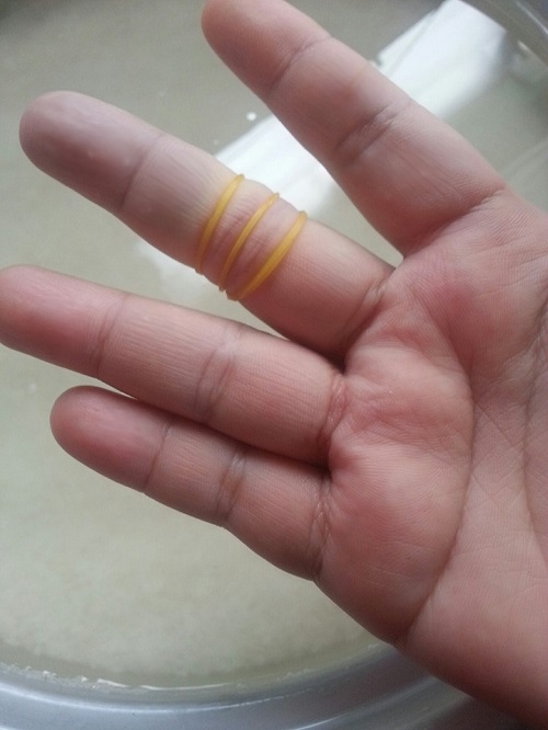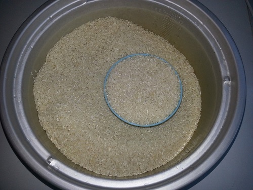 Kaji beras yang anda gunakan. Beras yang biasa (tidak keras tidak lembik), sukatan air betul-betul di tengah garisan jari tengah. Macam dalam gambar ini, saya guna beras biasa. Beras yang perlu guna banyak air, sukatan air guna garisan atas jari tengah. Dan beras yang jenis lembut, kurangkan penggunaan air. Gunakan garisan bawah jari tengah. Kawan-kawan boleh rujuk gambar jari tengah yang saya ikat gunakan getah untuk memudahkan kawan-kawan faham sukatan air beras.