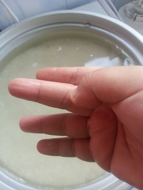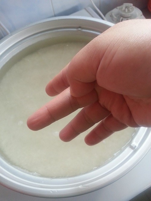 Saya gunakan beras biasa. Sukatan air betul-betul di tengah garisan jari tengah.