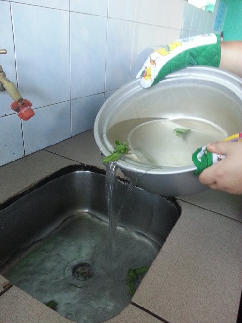 Sesudah air mendidih, buang air panas tersebut di dalam sinki. Selain kita akan mendapat nasi yang tidak cepat basi, kita juga akan mendapat saluran sinki yang bebas dari kotoran degil seperti minyak tepu yang terhasil dari minyak masak kegunaan harian serta lemak minyak dari ayam dan daging. Kebaikan 2 dalam 1.